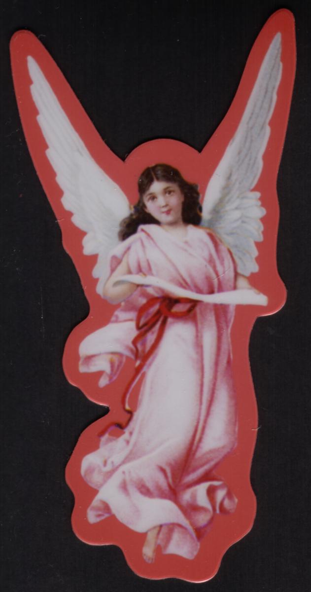 This collectible die-cut card features a detailed illustration of an angel with large white wings set against a vibrant red background. The angel is depicted with flowing brown hair and a serene facial expression, dressed in a pale pink robe that billows gracefully. A red sash tied around the waist adds contrast and movement to the figure.