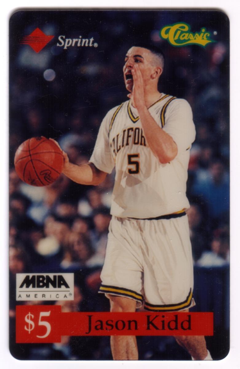 The card includes multiple logos: the Sprint logo at the top left, the Classic logo in green and yellow at the top right, and the MBNA America logo at the lower left. Across the bottom of the card is a red banner with "$5" on the left side and Jason Kidd’s name clearly printed in black letters on the right.