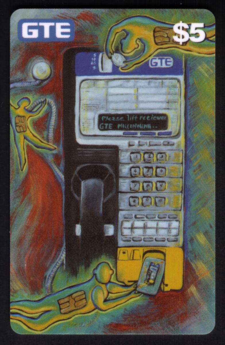 The overall background combines rich gradients of red, orange, yellow, and green, creating a dynamic, almost surreal atmosphere. This design merges functionality with artistic expression, directly connecting the card’s stored value purpose with GTE payphone usage through visual storytelling. The card is a $5 stored value smart chip card intended for use with GTE payphones.
