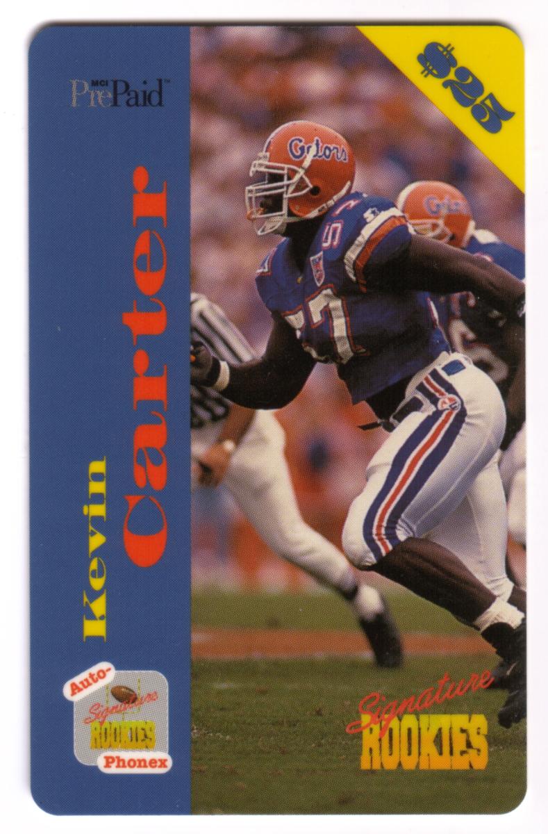 This collectible phone card features an action photograph of Kevin Carter, a notable football player, captured mid-play on the field. He is wearing an orange helmet with the Florida Gators logo and a blue football uniform with white pants that have blue and orange stripes. Carter is shown in a running stance, looking ahead with determination.
