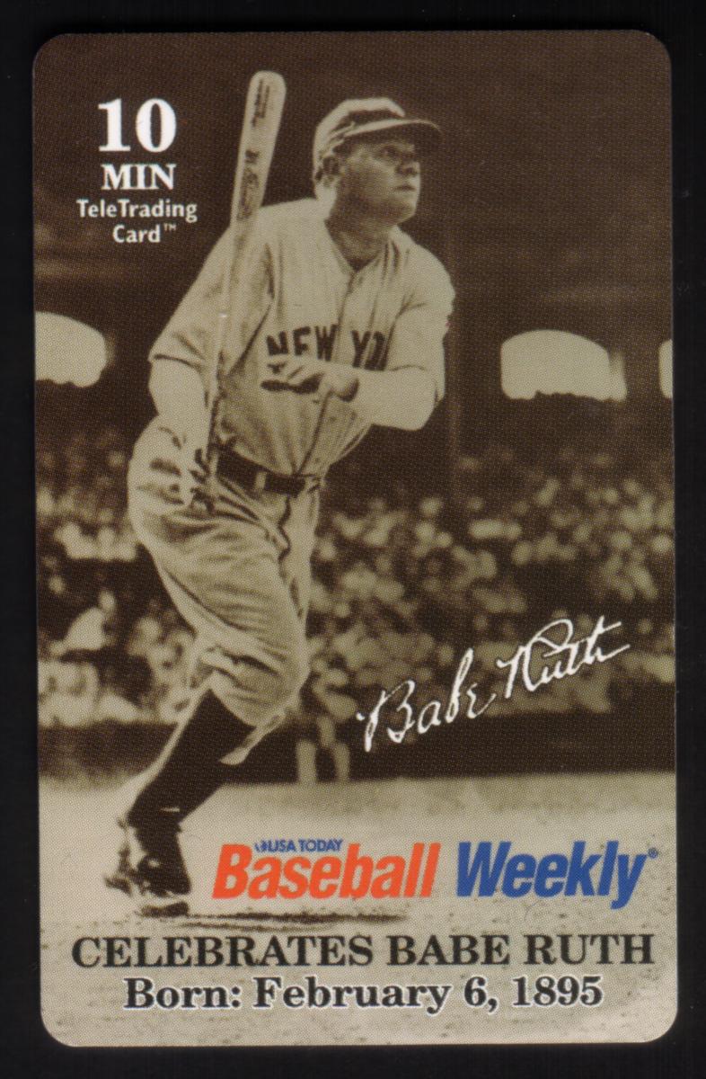 The card is marked with "10 MIN" in the upper left corner, indicating a 10-minute phone card value. Below that is the text "TeleTrading Cardâ„¢." Near the bottom center, the logo for "USA TODAY Baseball Weekly" is printed in a combination of blue and red fonts. Underneath the logo, the text reads: "CELEBRATES BABE RUTH" followed by "Born: February 6, 1895," providing historical context about the baseball legend.