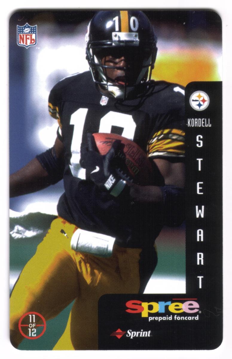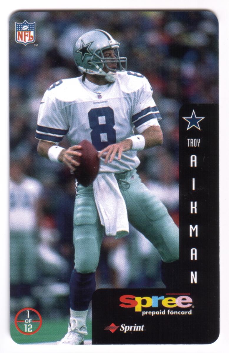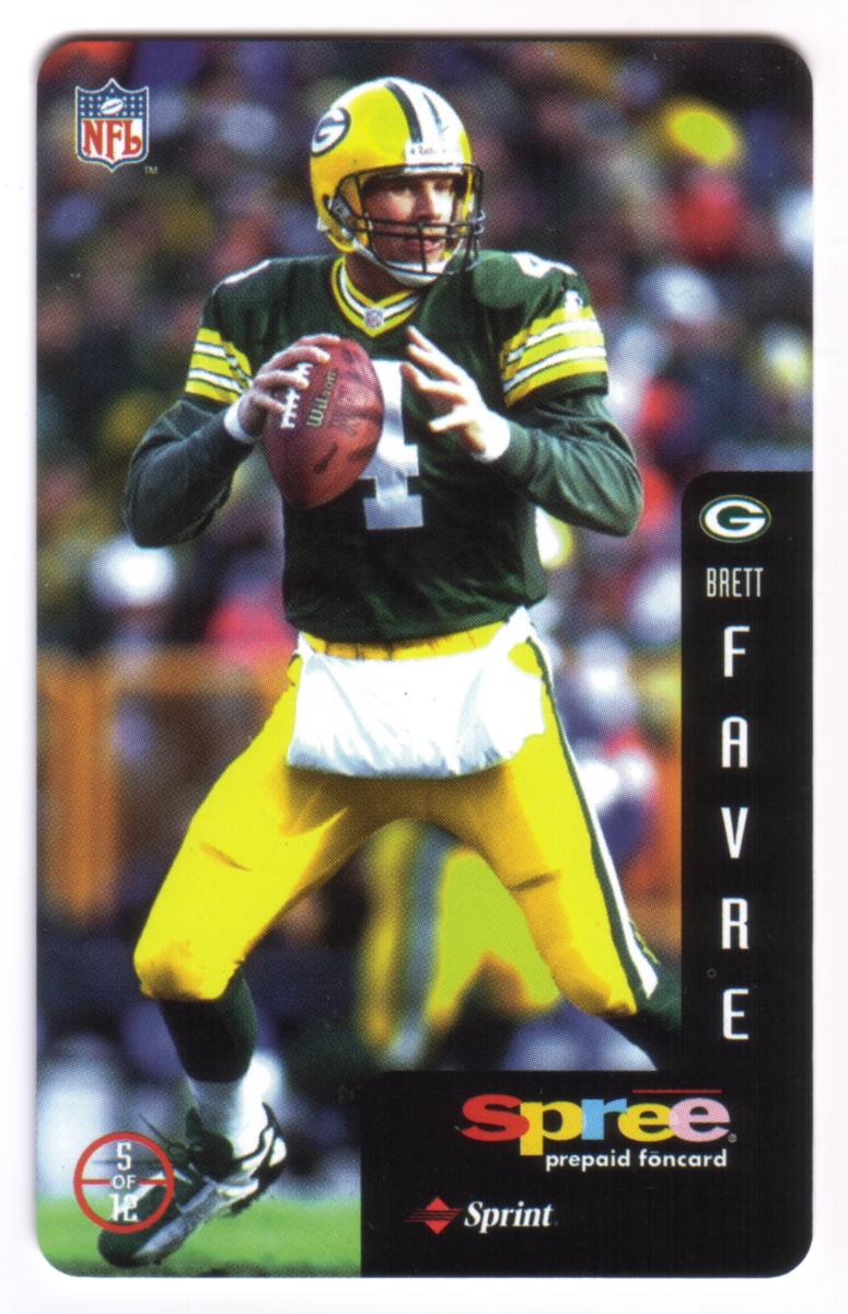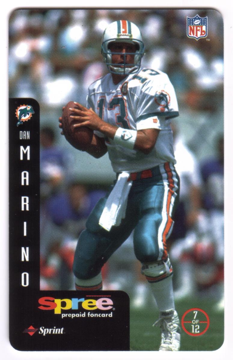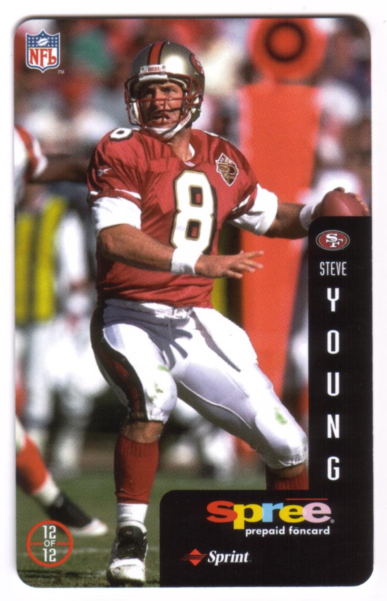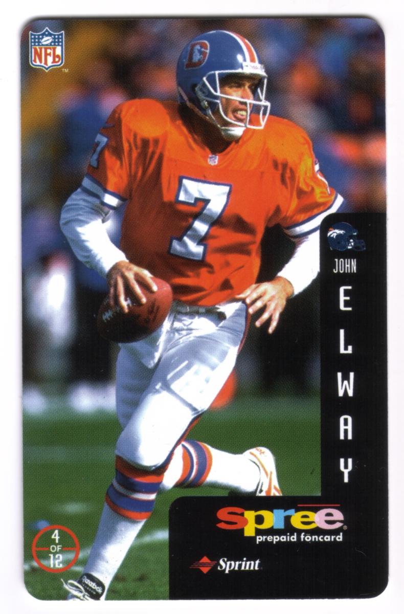 This complete set of 12 prepaid phone cards from Sprint's Spree series features legendary National Football League quarterbacks and players celebrated as heroes of the game. Each card showcases a full-color action photograph of an NFL athlete in game attire, holding or preparing to throw a football, representing their respective teams. The cards include a vertical black side panel with the player's team logo, first name in smaller text, and last name in large vertical letters.