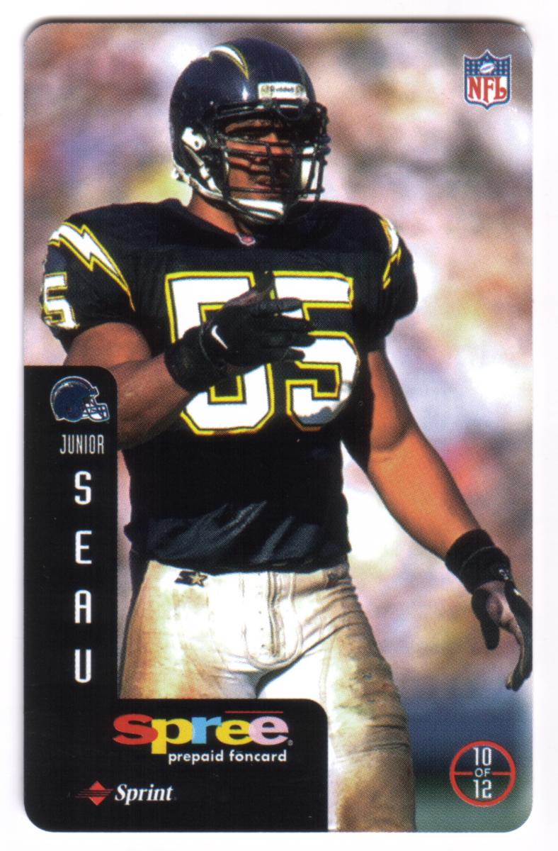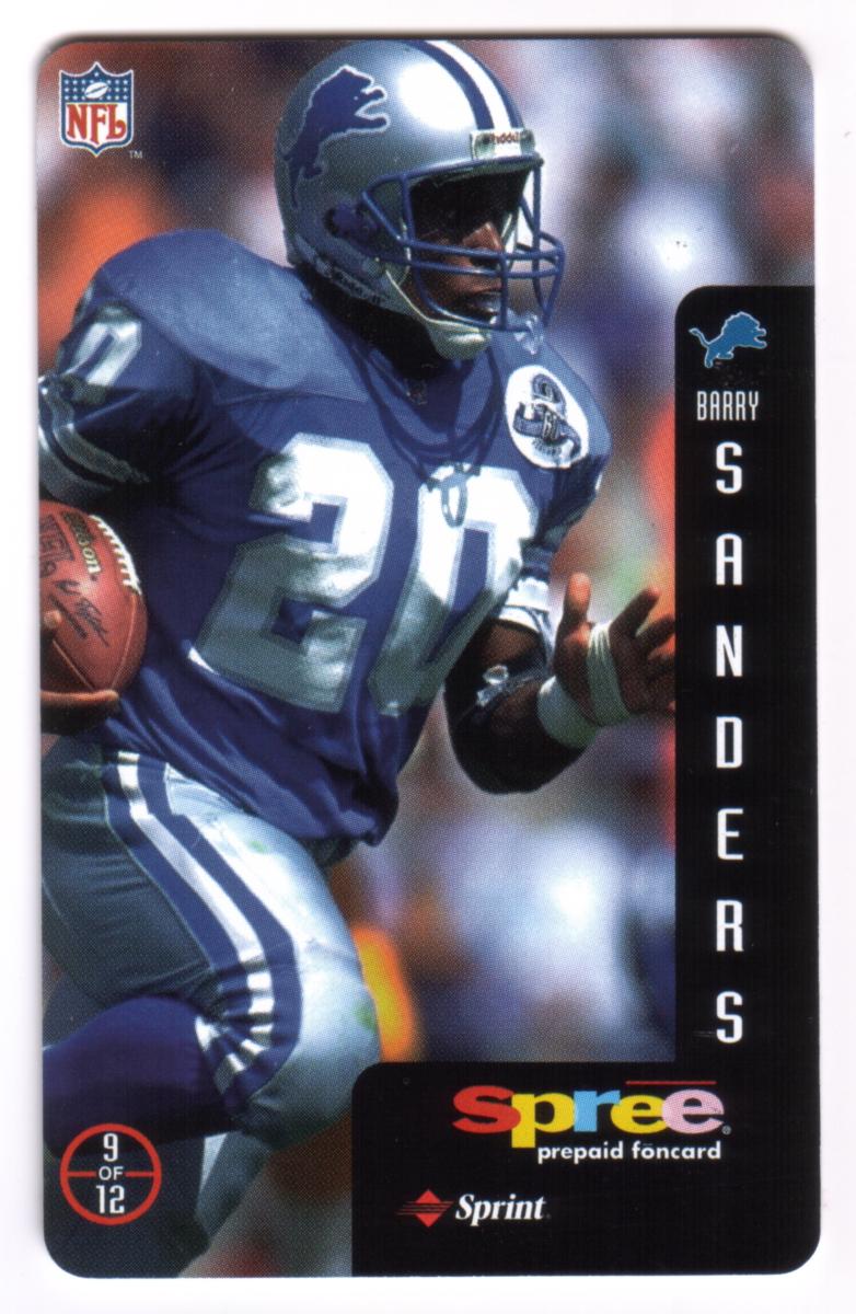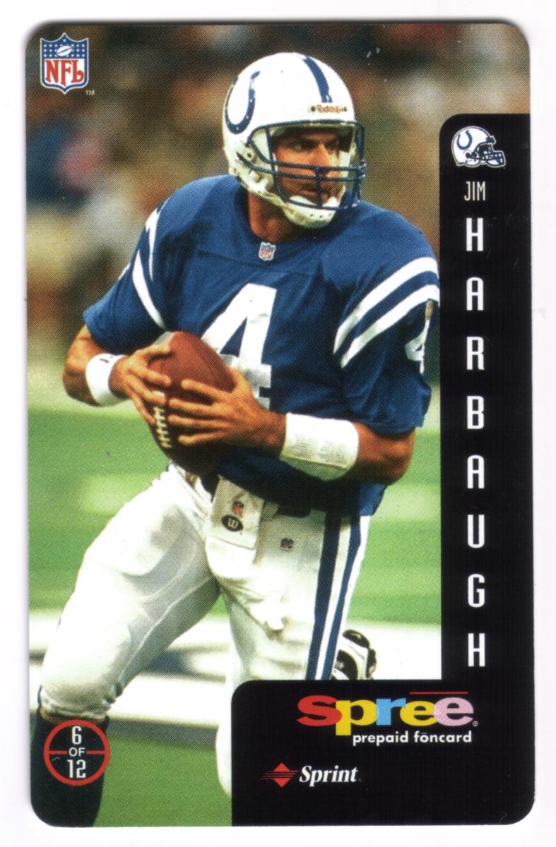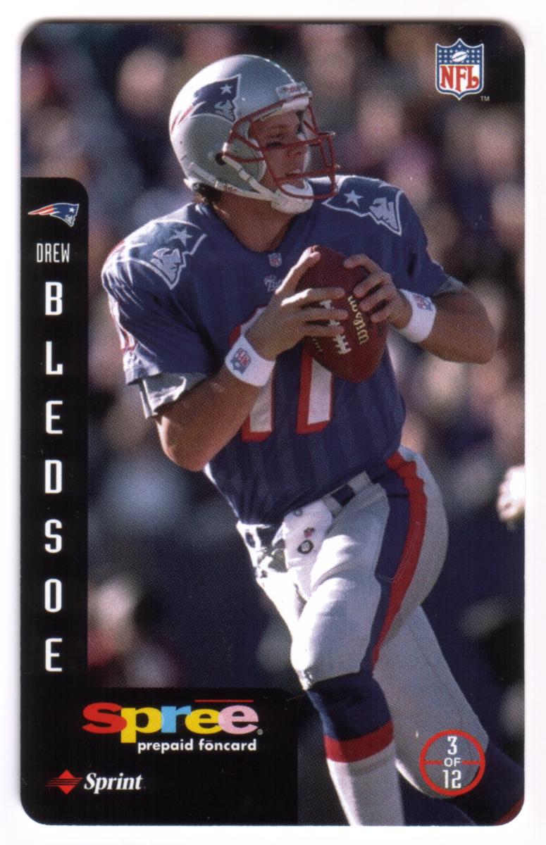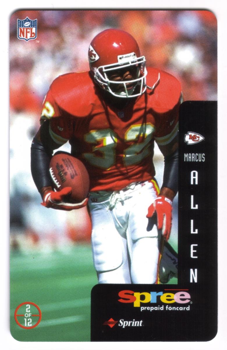 This complete set of 12 prepaid phone cards from Sprint's Spree series features legendary National Football League quarterbacks and players celebrated as heroes of the game. Each card showcases a full-color action photograph of an NFL athlete in game attire, holding or preparing to throw a football, representing their respective teams. The cards include a vertical black side panel with the player's team logo, first name in smaller text, and last name in large vertical letters.