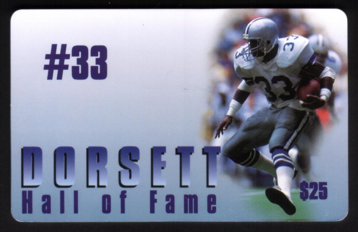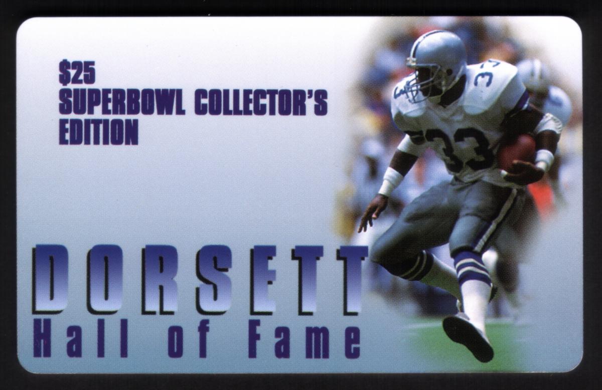The first card is labeled "$25 SUPERBOWL COLLECTOR’S EDITION" in purple text at the top left. Below this, in large gradient purple to blue letters, is the name "DORSETT," with "Hall of Fame" written underneath in a smaller, dark purple font. The right half of the card displays an action photograph of Tony Dorsett running with the football wearing a white uniform with silver pants and a silver helmet with a star logo, representing the Dallas Cowboys.