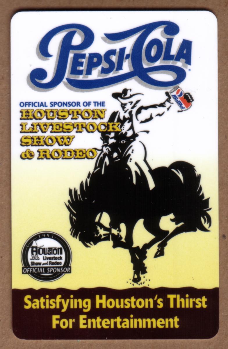 This collectible card features a bold design promoting Pepsi-Cola as the official sponsor of the Houston Livestock Show & Rodeo. The top of the card prominently displays the blue script Pepsi-Cola logo against a white background. Below the logo, the text "OFFICIAL SPONSOR OF THE HOUSTON LIVESTOCK SHOW & RODEO" appears in capital letters, with "HOUSTON LIVESTOCK SHOW & RODEO" highlighted in yellow with a black outline.