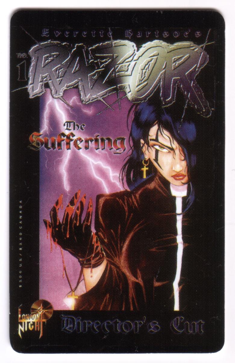 The background of the card is a stormy, purple-hued sky with vivid lightning bolts, enhancing the dramatic and supernatural atmosphere. The title "RAZOR" appears prominently at the top in a metallic, cracked font style. Below that, "The Suffering" is written in a gothic font with a mix of red and black coloring. Near the bottom left corner, there is a small circular emblem containing the text "london NIGHT." The bottom edge features the words "Director's Cut" in dark, stylized gothic lettering.