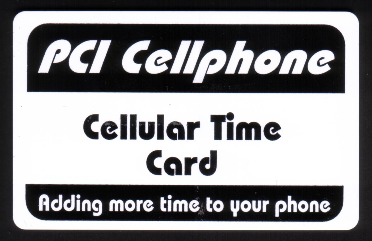 This collectible card is a PCI Cellphone Cellular Time Card designed for adding more time to a cellular phone. The card features a simple, bold design with black and white colors. At the top, the text "PCI Cellphone" is displayed in a stylized font inside a black rectangular box with rounded corners and white lettering. Below that, the text "Cellular Time Card" appears in a large, black, rounded font on a white background.