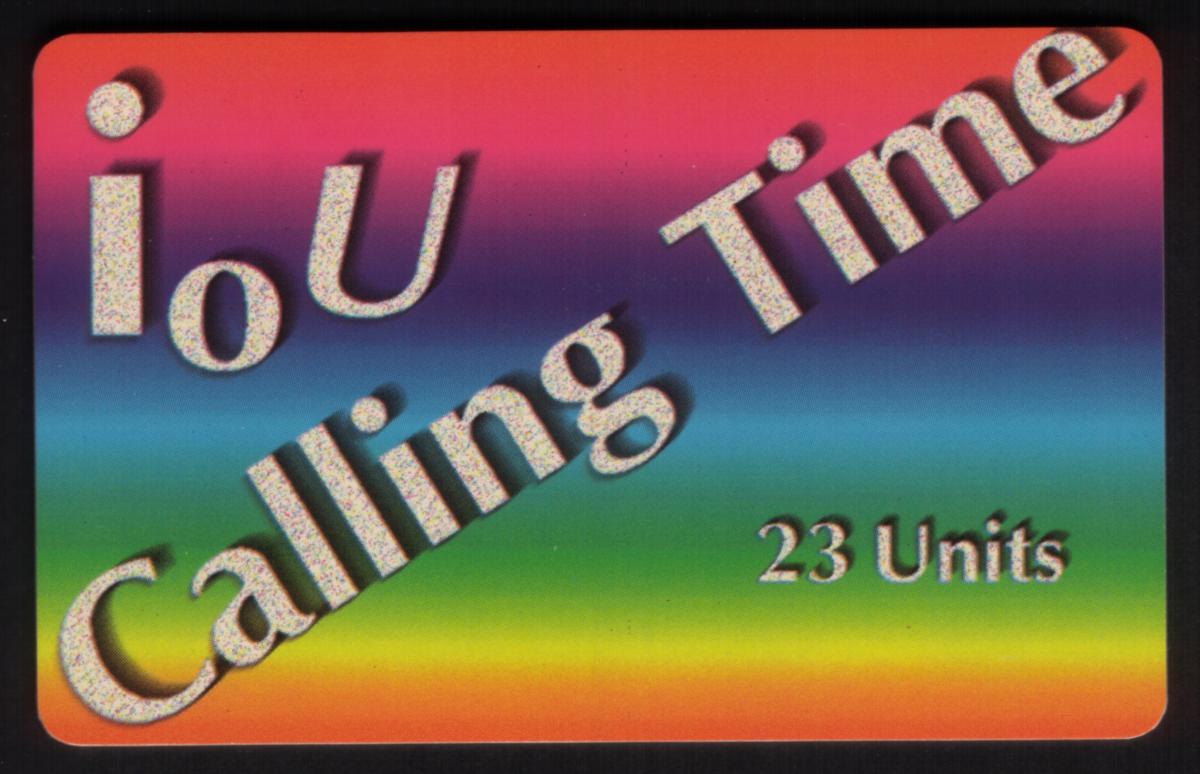 This collectible prepaid phone card features a bold and colorful gradient background transitioning horizontally through vibrant red, purple, blue, green, and yellow stripes. The large, silver-textured lettering diagonally across the card reads "ioU Calling Time," with "ioU" positioned in the upper left corner and "Calling Time" extending from the bottom left to the upper right corner. On the right side, "23 Units" is printed in a smaller font with the same silver texture.