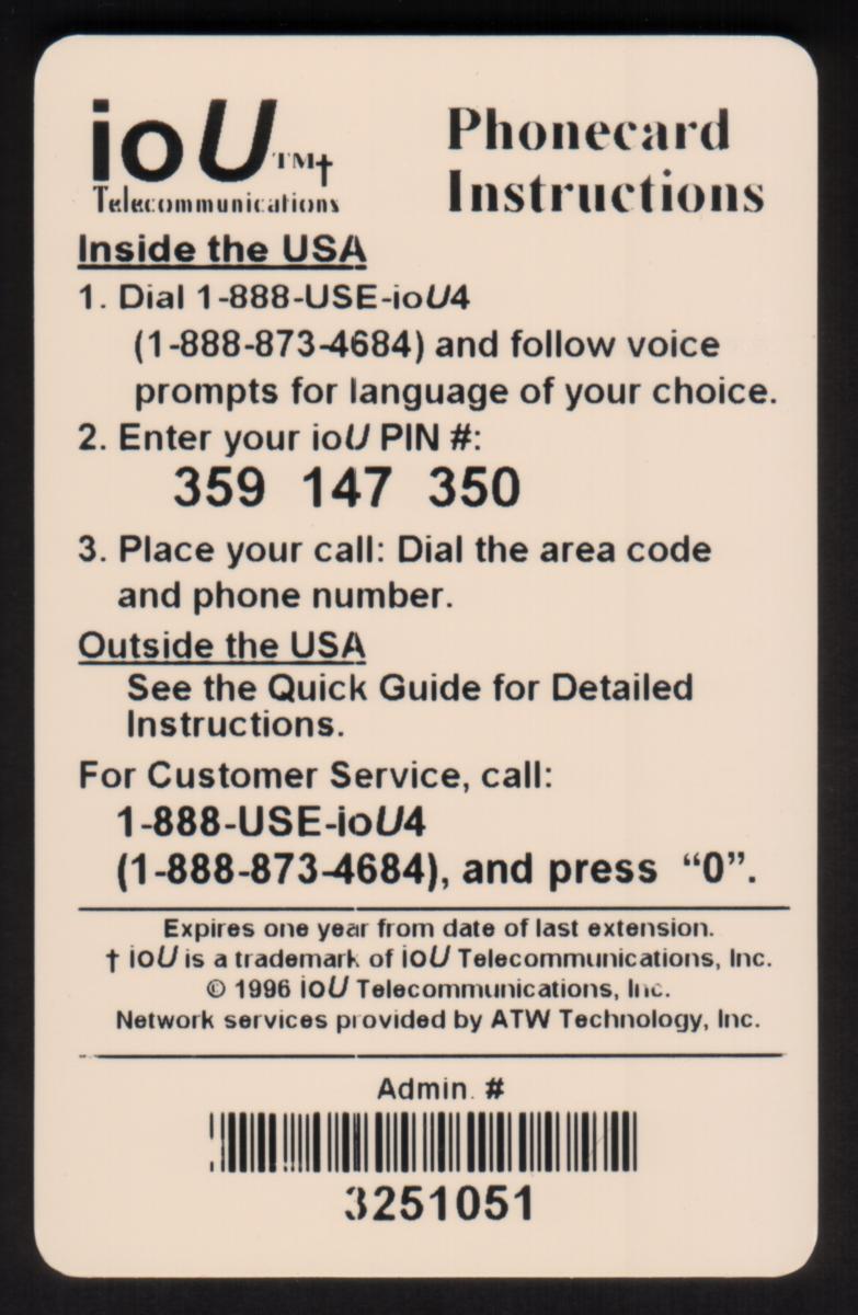 This card is associated with ioU Network Services and relates to ATW Technology. It was issued in 1996 and represents prepaid phone time that has expired. The overall design is artistic with a strong visual appeal due to the multicolored background and metallic text effect.