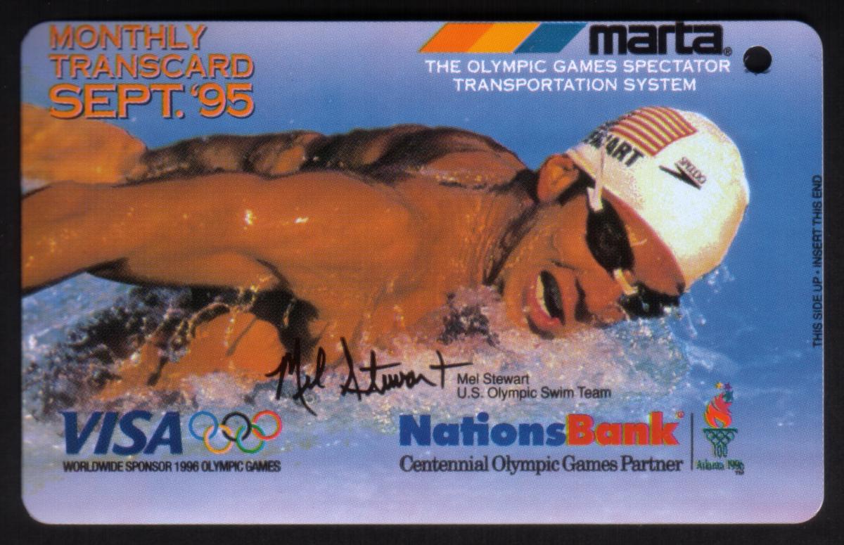 The lower part of the card has several sponsor logos and texts. On the left side is the blue VISA logo with the Olympic rings beneath and the note "WORLDWIDE SPONSOR 1996 OLYMPIC GAMES." To the right is the NationsBank logo, part orange and part blue, accompanied by "Centennial Olympic Games Partner." The official Atlanta 1996 Olympic Games emblem appears at the lower right corner. The design and text identify this as a Monthly Transcard issued in September 1995 that highlights Mel Stewart, swimming, and the associated Olympic and public transit sponsorships tied to the Atlanta 1996 Olympic Games.