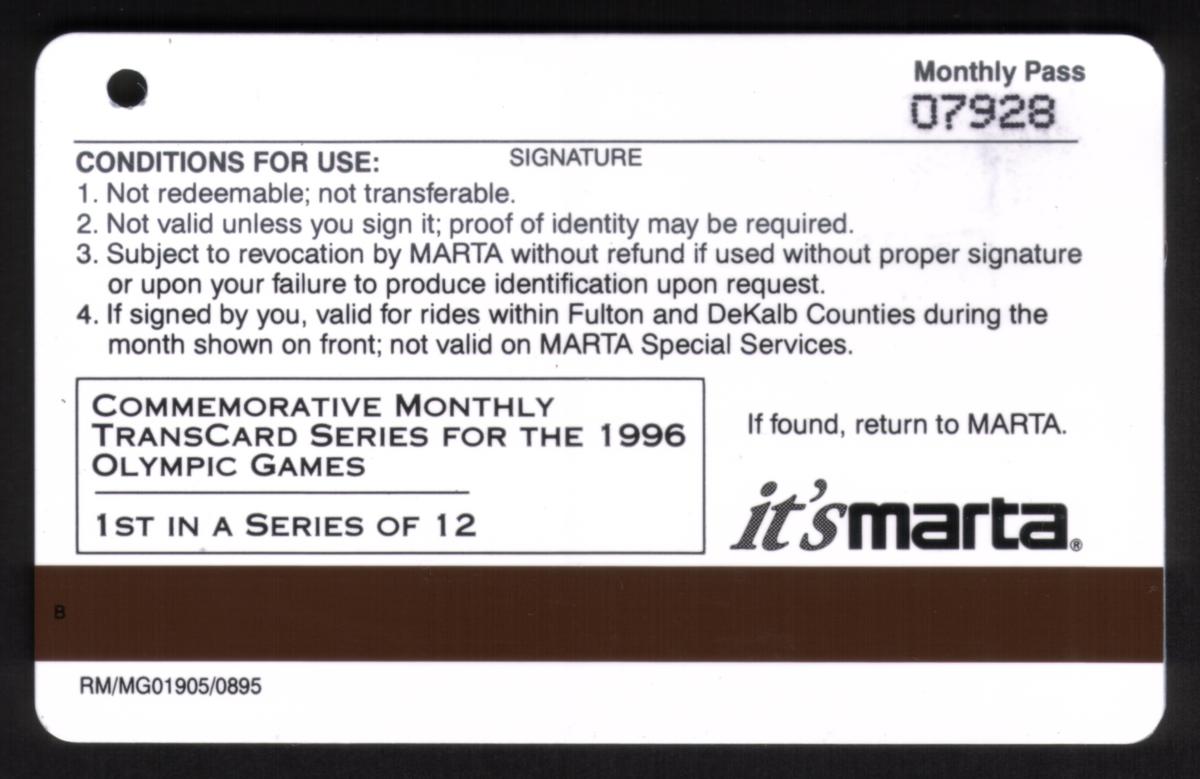 At the top left, the text "MONTHLY TRANSCARD SEPT. ‘95" is displayed in orange capital letters. The top right corner features the black "marta" logo with the caption "THE OLYMPIC GAMES SPECTATOR TRANSPORTATION SYSTEM," referring to the Metropolitan Atlanta Rapid Transit Authority’s transport service during the 1996 Olympic Games.