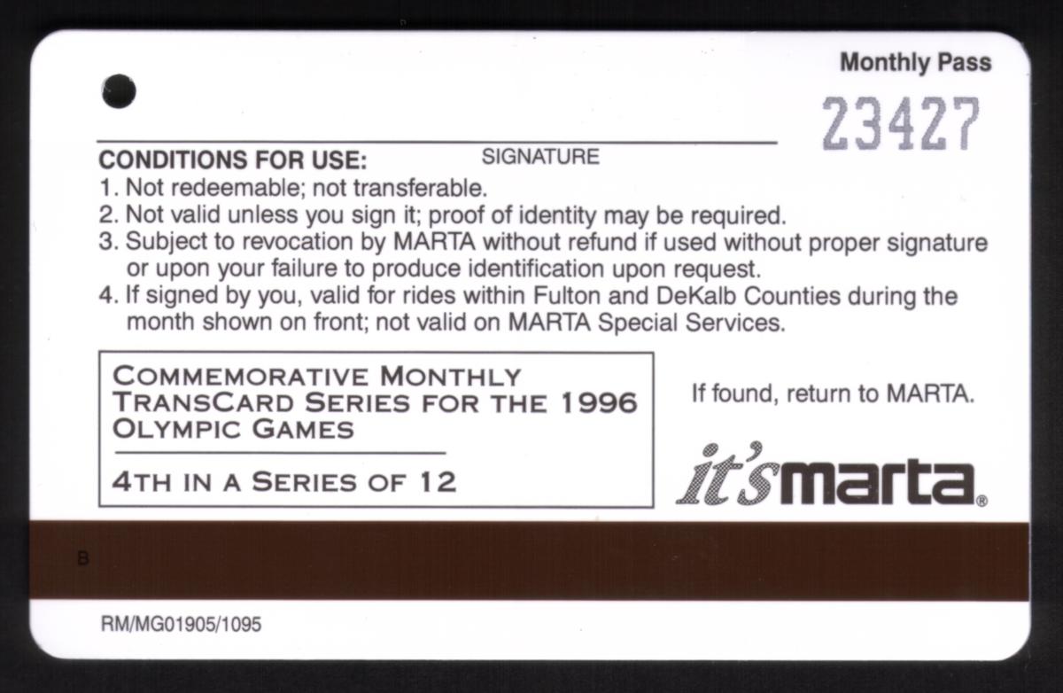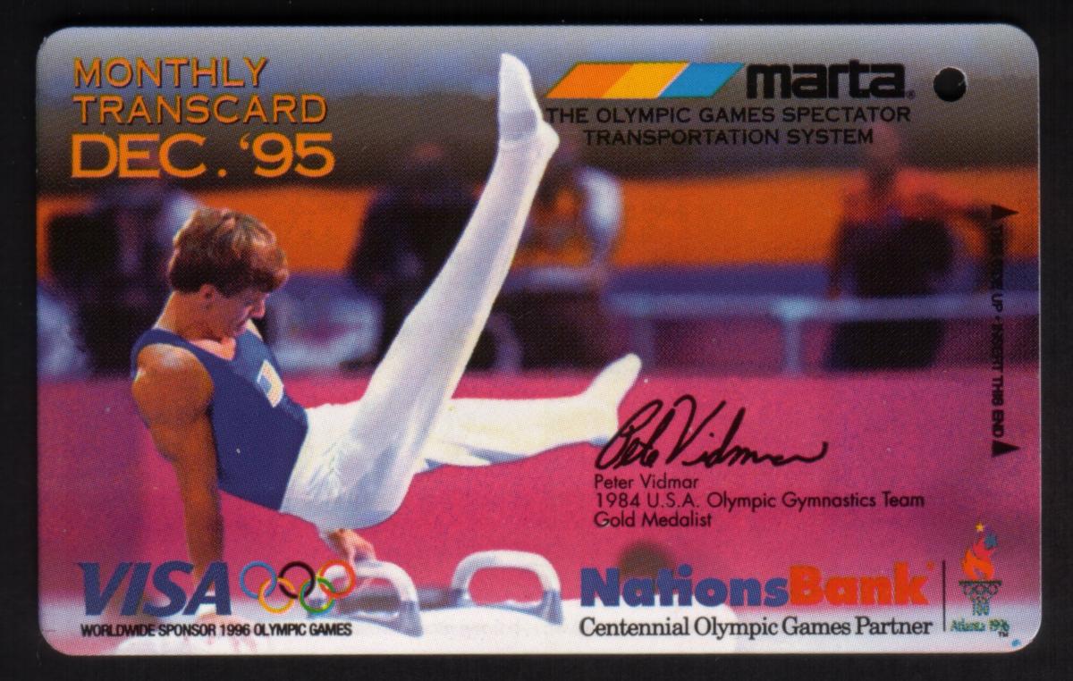 The design incorporates bold colors with orange and blue tones in the background, emphasizing the athletic image and the official partnership logos. This card is associated with the USA Olympic Gymnastics team, Atlanta’s transit system for the Olympic Games, and commemorates the 1996 summer event in metropolitan Atlanta.