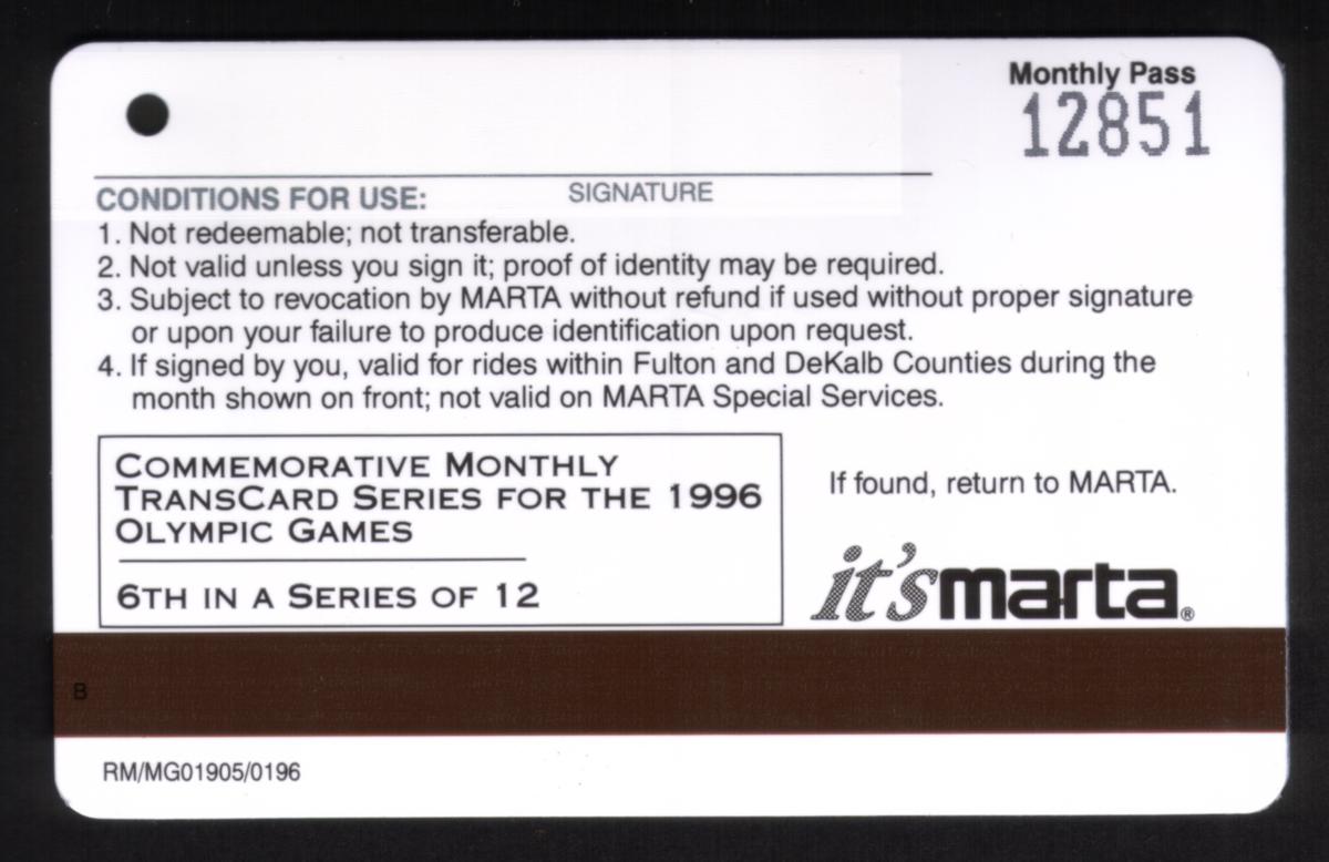 Text on the card includes “MONTHLY TRANSCARD FEB. ‘96” in bold orange lettering at the bottom left, identifying it as a monthly Transcard for February 1996. The card clearly associates with Olympic Games travel and spectator transportation within metropolitan Atlanta under the Metropolitan Atlanta Rapid Transit Authority (MARTA). The combination of athletes, transportation, and corporate sponsors emphasizes the official nature of this 1996 Olympics collectible.