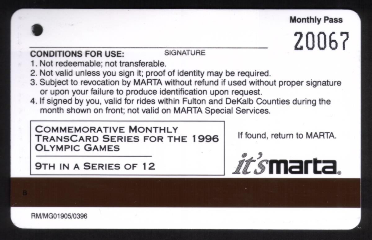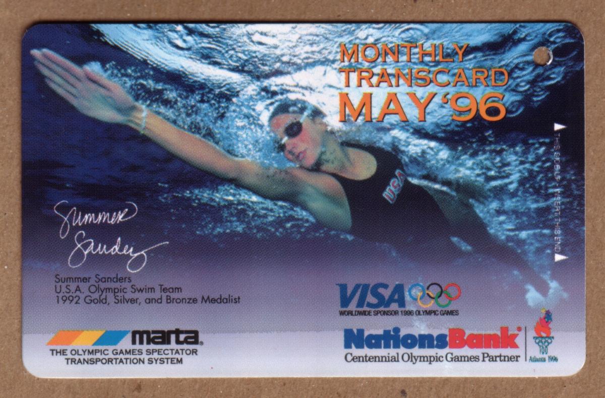 This card is connected to the 1996 Summer Olympics held in Atlanta, Georgia. It relates to the Metropolitan Atlanta Rapid Transit Authority (MARTA) and promotes the official spectator transportation system for the Olympic Games. The card combines Olympic-themed imagery, sponsorship branding, and transit information in a sleek, horizontally oriented design.