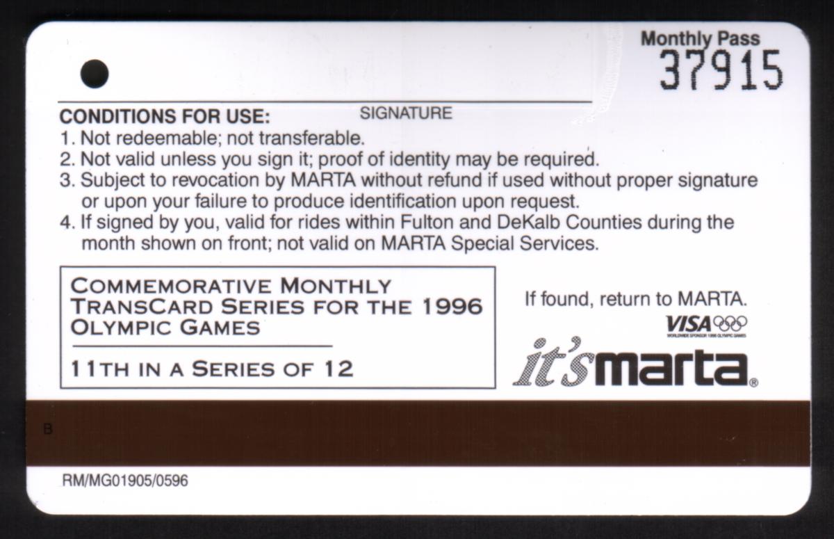 This collectible Monthly Transcard from July 1996 features Michael Johnson, a member of the U.S.A. Track Team and 1992 Olympic Gold Medalist, in mid-stride during a sprint. The card is issued by MARTA, the Metropolitan Atlanta Rapid Transit Authority, highlighting its role as The Olympic Games Spectator Transportation System for the 1996 Atlanta Olympic Games. Michael Johnson wears his U.S.A. uniform, numbered 357, while running against a blurred background symbolizing speed and motion.