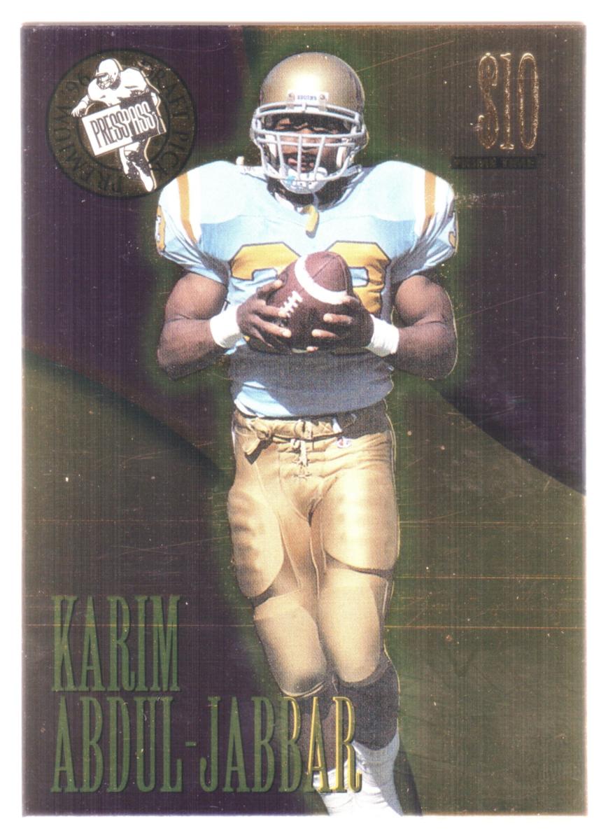 In the upper left corner, there is a circular emblem containing an image of a running football player and the text "PRESS PASS." The card has a denomination value of $10 printed in the top right corner in gold. At the bottom left, the name "KARIM ABDUL-JABBAR" is printed vertically in green, using a serif typeface that stands out against the background.