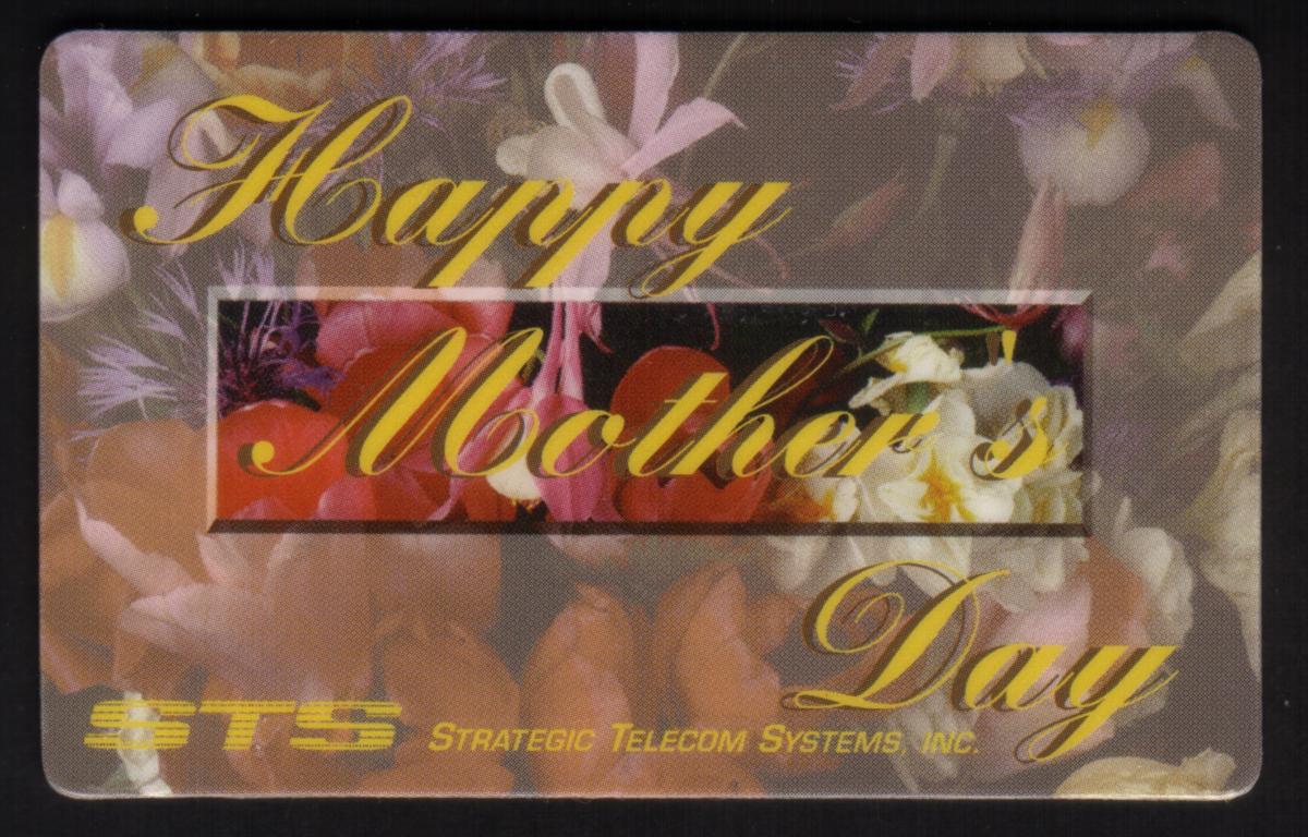 The card prominently displays the greeting "Happy Mother's Day" in large, elegant white and pink script on the right side, standing out against the colorful flower arrangement on the left. The STS logo appears in the upper left corner, while "Phonetime Greetings" is printed in the bottom left corner, indicating its intended use. The words "Strategic Telecom Sys." are printed along the bottom edge of the card.