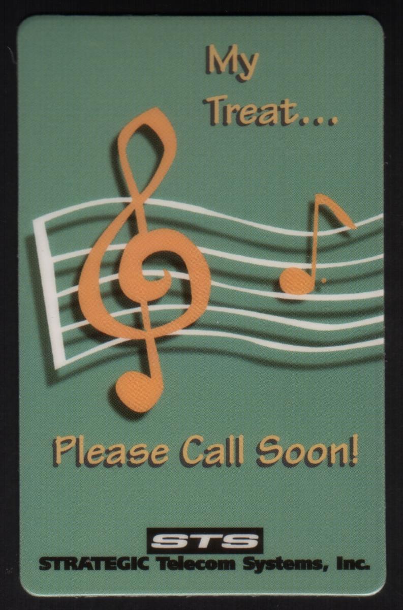 The card’s central theme is music, highlighted by the prominent treble clef graphic incorporated into the design. The text on the card reads, “My Treat... Please Call Soon!” indicating it is a phonetime greeting card intended to combine musical artistry with a personal message.