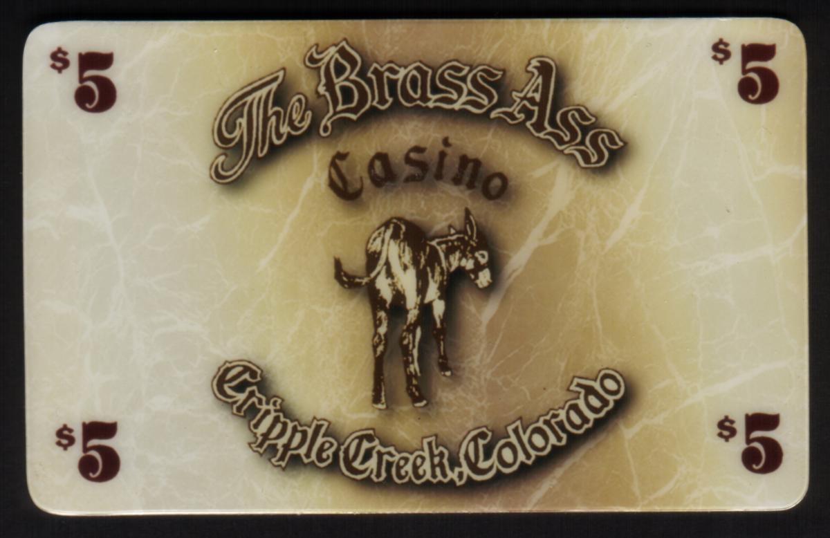 This collectible promotional card features a $5 denomination from The Brass Ass Casino located in Cripple Creek, Colorado. The card’s design centers on the name "The Brass Ass" displayed in a stylized, antique-like script at the top. Below the casino name is a detailed image of a donkey, standing and facing slightly to the left, rendered in a sepia tone that matches the card’s overall warm beige and brown marbled background.