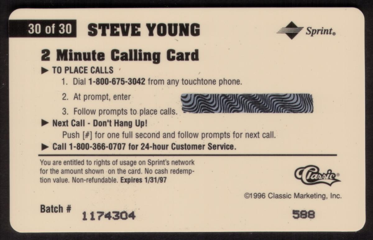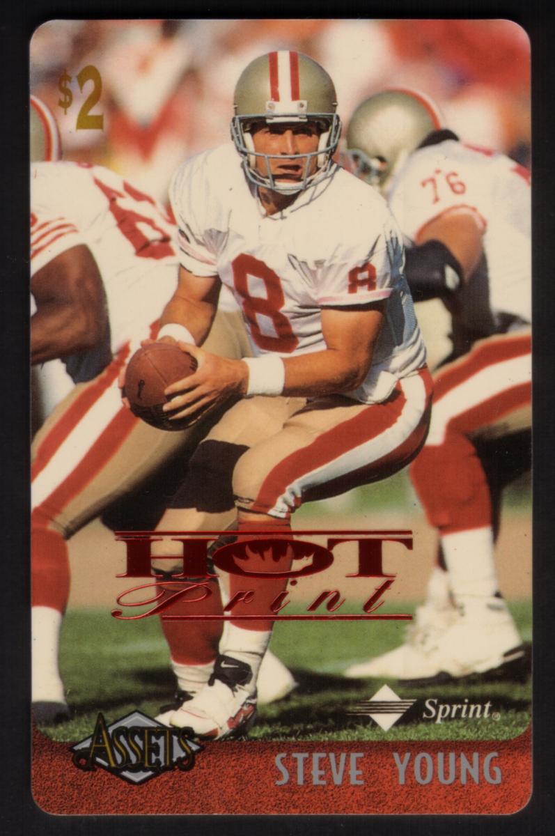 The card has a printed value of $2 in the upper left corner and includes the "HOT PRINT" logo in the center at the bottom, along with the word "Sprint" and its associated logo in the bottom right corner. The lower left corner displays the "Assets" logo with the card series reference "Assets '96." The player’s name, "Steve Young," is printed in white text along the bottom edge of the card.