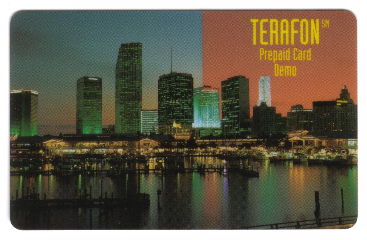 Overall, the card displays a striking and detailed nighttime cityscape of New York, specifically highlighting the World Trade Center within the urban environment, paired with the Terafon branding and prepaid demo status on the right.