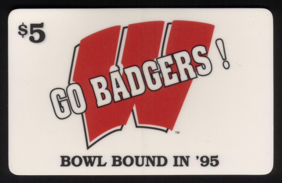 This collectible card is a Kohl’s promotional phone card featuring the University of Wisconsin Football team with the theme “Go Badgers! Bowl Bound in ’95.” The image showcases a Wisconsin Badgers football helmet prominently displayed against a background with a white backdrop and a large red block letter “W” to the upper right. The helmet is red with a white facemask and features the distinctive white “W” logo on the side, symbolizing the University of Wisconsin.