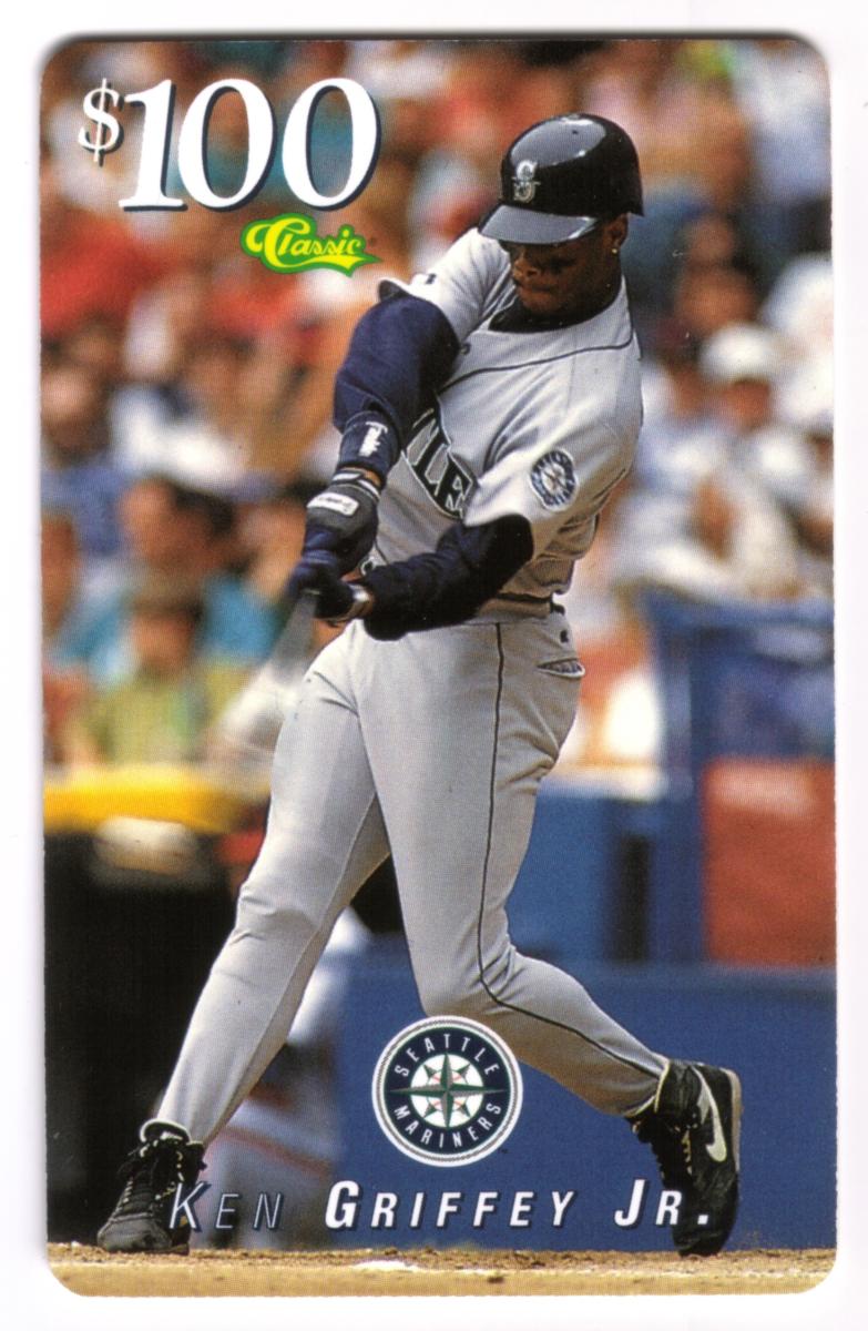 This collectible chip card features a color action photograph of Ken Griffey Jr., a Major League Baseball player for the Seattle Mariners. He is captured mid-swing, wearing the Mariners' gray away uniform, marked with the team’s logo on his helmet and sleeve patch. The card displays a $100 value in the top left corner alongside the "Classic" logo in green and yellow script.