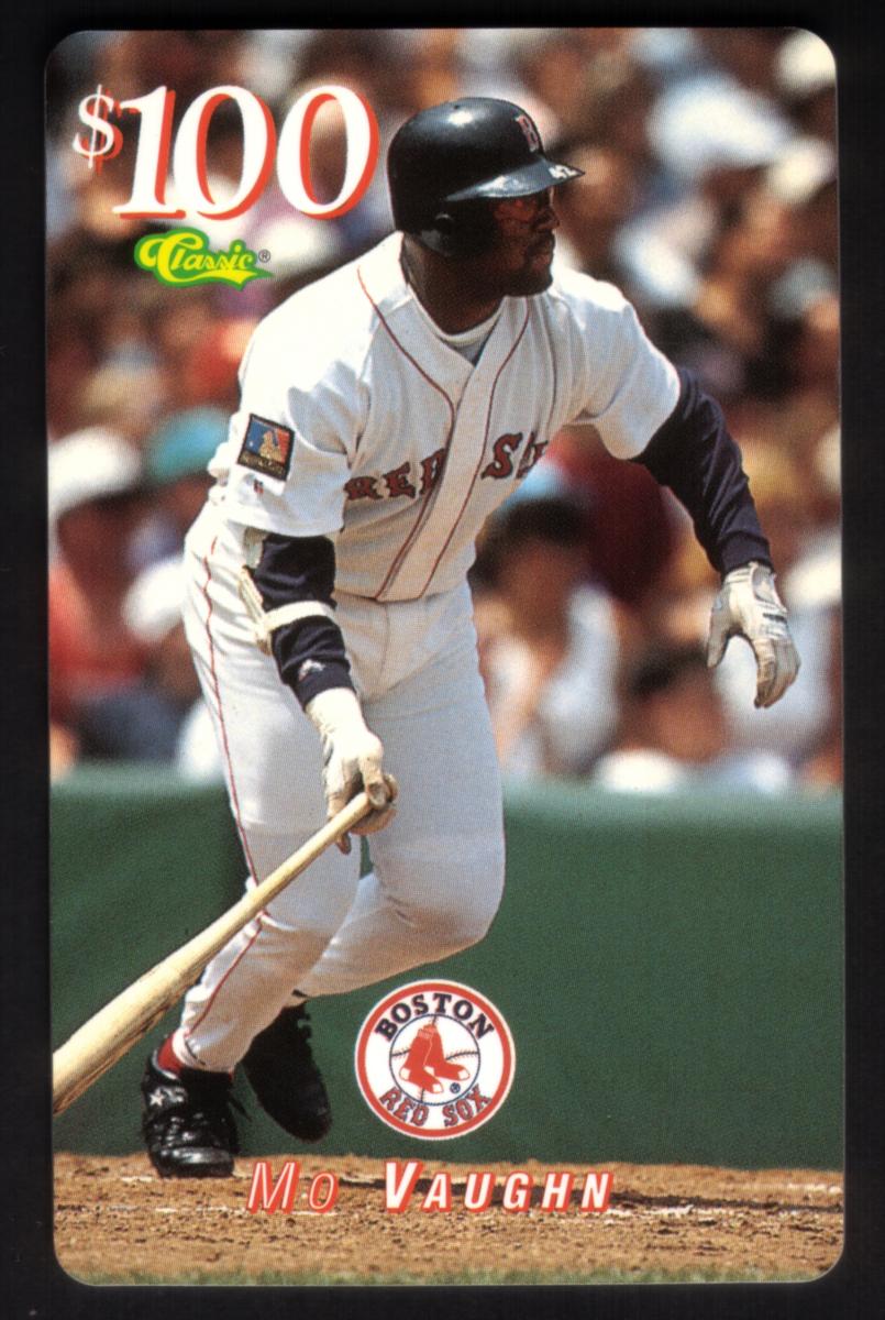 Additional details include the phrase "mci $100" printed on the card, connecting it to the telecommunications company MCI. The overall presentation highlights baseball and Mo Vaughn’s role as a key player within the Boston Red Sox organization during that period.