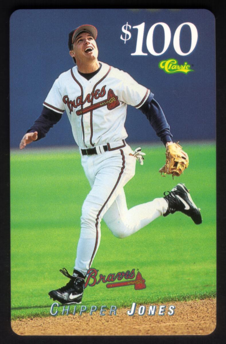 This collectible item is a 1995 Major League Baseball (MLB) giveaway card featuring Chipper Jones, a notable player for the Atlanta Braves. The card displays a detailed full-color image of Chipper Jones in his Atlanta Braves uniform, holding a baseball bat. The photograph captures Jones in a baseball stance, emphasizing his role as a batter. The MLB logo is visible on the top left corner, alongside “Major League Baseball” text and the Atlanta Braves team name. The card also features “The Score Board (MCI)” logo in the lower right corner, indicating the issuer or series associated with this collectible.