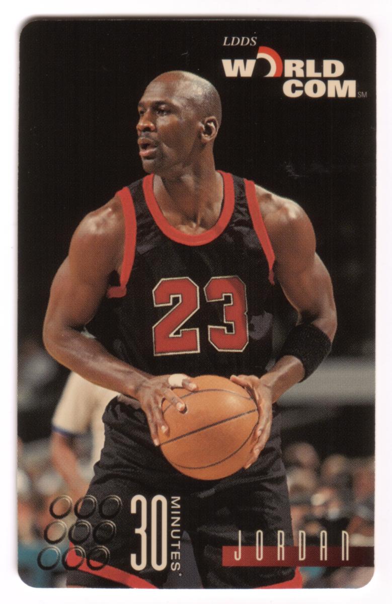This collectible phone card features a photographic image of Michael Jordan, the famed basketball player, wearing a black and red basketball jersey with the number 23 prominently displayed on the front. He is shown holding a basketball in both hands, preparing to make a play. The background includes a blurred crowd, suggesting an in-game action setting.