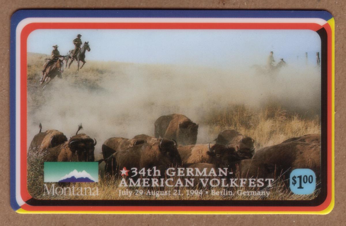 The card also includes text references to the "34th German-American Volkfest," connecting it to a cultural event celebrated in Berlin, Germany. The presence of Native American imagery, along with buffalo and horses, emphasizes Montana’s rich wildlife and indigenous heritage. The card’s monetary value is indicated as $1.34, marking its use as a prepaid phone card.