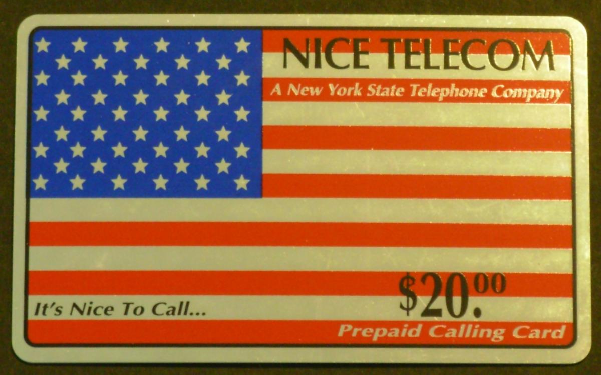 Along the right edge of the card, the value of "$20." is clearly printed, indicating its monetary worth for calling purposes. Above this, the name "Nice Telecom" appears in a modern font, identifying the issuing telecommunications company. The background of the card is a clean, deep blue which enhances the visibility of the flag and text elements. The overall presentation is bold and sharp, reflecting a strong sense of American pride.