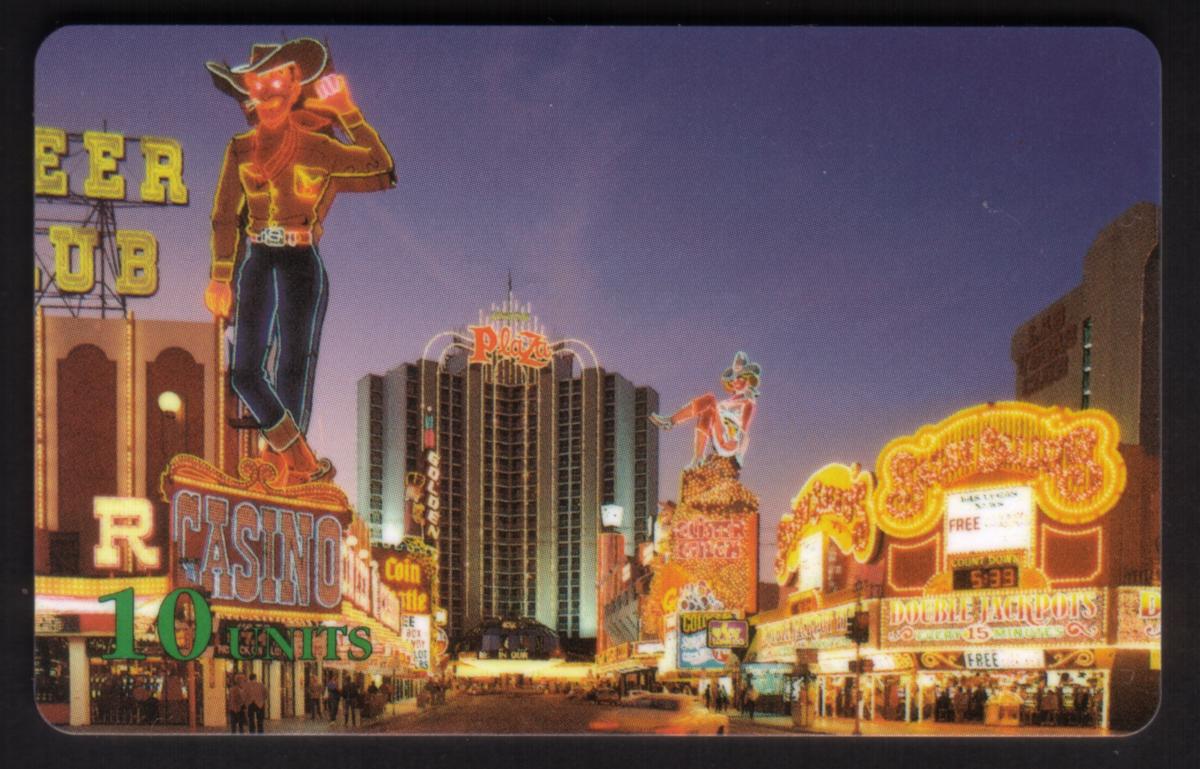 This collectible phone card features a vibrant nighttime view of the Las Vegas Strip in Nevada. Prominently visible is the Plaza Hotel & Casino building, illuminated with bright neon lights and signage. To the left, a neon cowboy figure, known as Vegas Vic, stands tall above the "CASINO" sign. The image captures a lively urban street scene with crowds and the glowing atmosphere of Las Vegas's famous gambling and entertainment district.