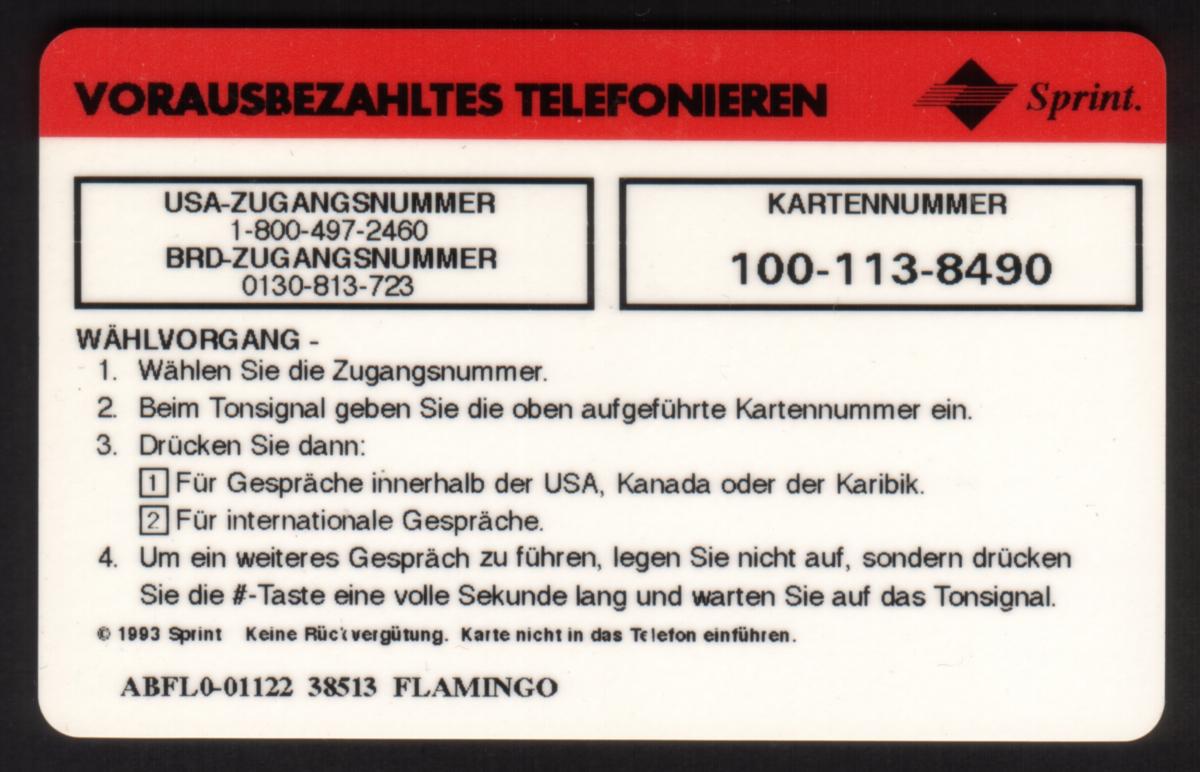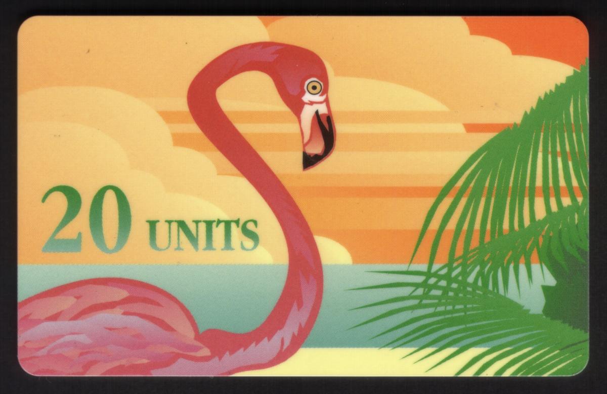 The card prominently displays the denomination "20 UNITS" in bold green letters on the left side. The card is marked with "Flamingo (International) 1993 German Reverse - Sprint" indicating its origin and issuing network.