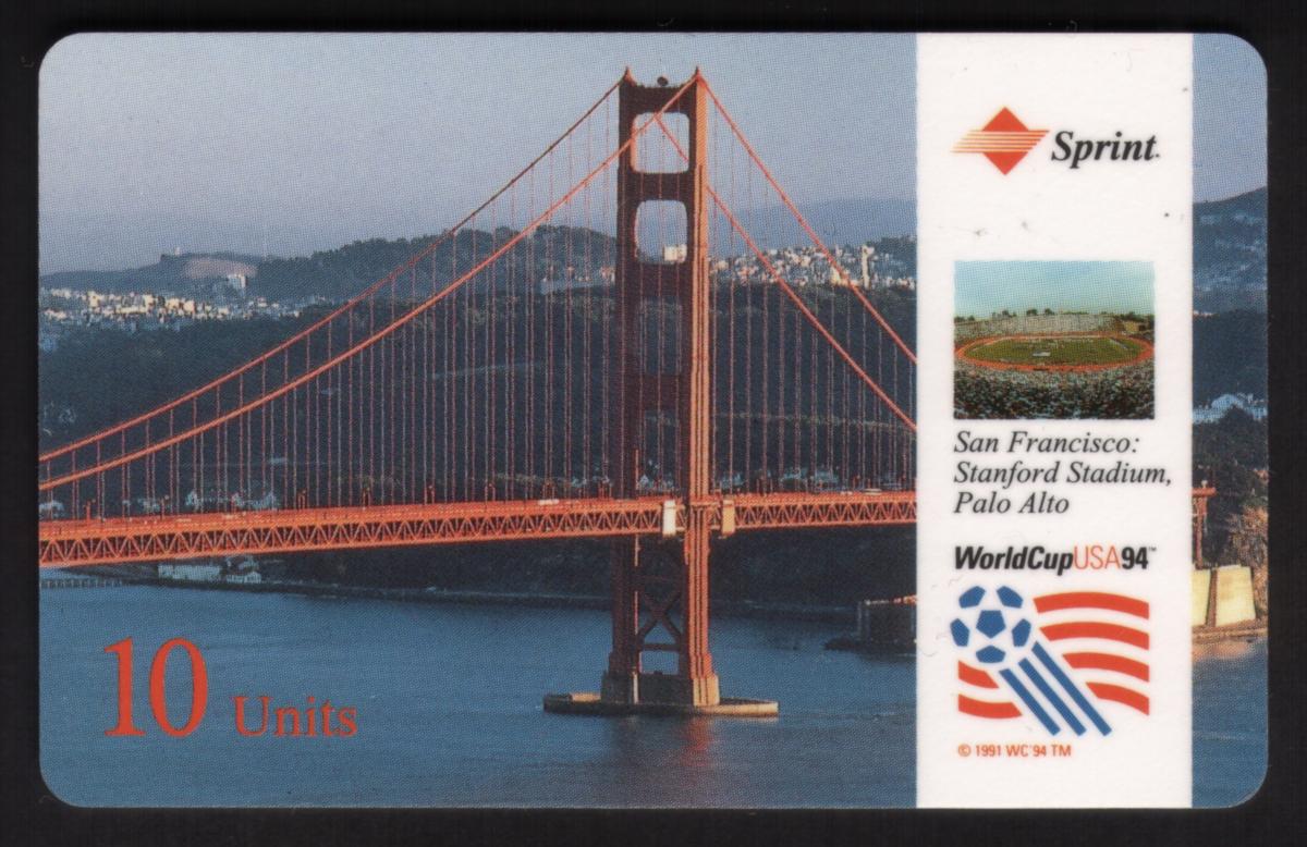 Overall, this card serves as a collector's item celebrating the 1994 World Cup soccer event, tying together iconic California landmarks including the Golden Gate Bridge and Stanford Stadium, a key venue for the tournament. The design integrates sporting event branding, local imagery, and the Sprint brand clearly and factually.