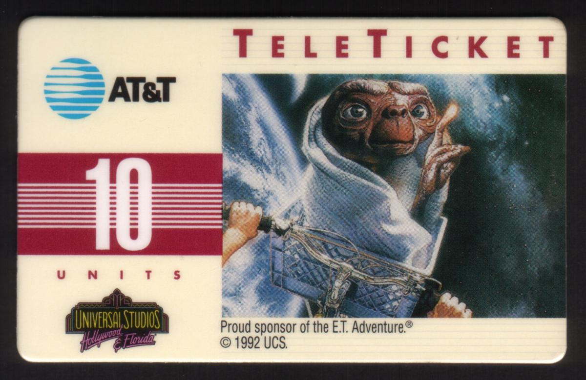 The card is branded with the AT&T logo in blue on the upper left side. Below the logo, the value of the card is shown as "10 UNITS" in large white numbers against a red horizontal stripe. The Universal Studios Florida logo is located near the lower left corner, accompanied by the text "Proud sponsor of the E.T. Adventure® © 1992 UCS." This phone card represents an entertainment and movie-themed collectible linked to Universal Studios and AT&T Teleticket services.