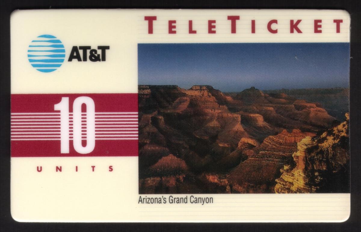 The card is an AT&T Teleticket with a value of 10 units, indicated on the left side beneath the AT&T logo. The word "TELETICKET" is printed across the top right above the photograph. Below the image, there is text that reads "Arizona's Grand Canyon," identifying the location captured in the photo.
