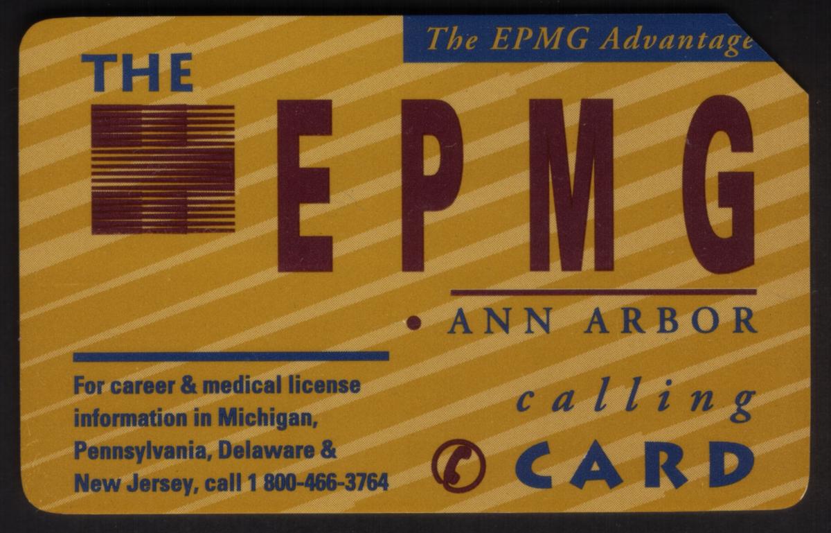 This collectible phone card features promotional information for The EPMG Advantage, focusing on Career and Medical License Information, specifically tied to Ann Arbor, Michigan. The card prominently displays the text "The EPMG Advantage," emphasizing its association with services related to career advancement and medical licensing. Below this, the location "Ann Arbor" is clearly shown, linking the promotion directly to that city.