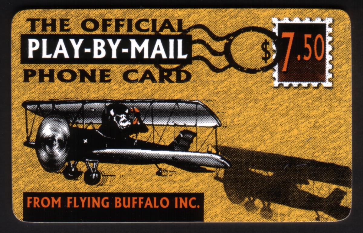 Below the biplane image, the card includes the wording "FROM FLYING BUFFALO INC." in uppercase, orange letters against a black rectangular background. The overall design highlights the connection to the official play-by-mail service operated by Flying Buffalo Inc., emphasizing the collectible nature of this phone card.