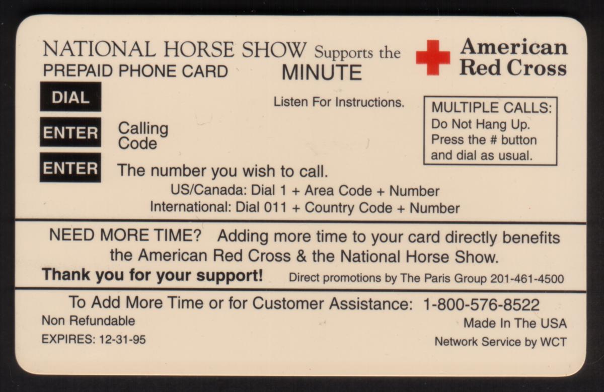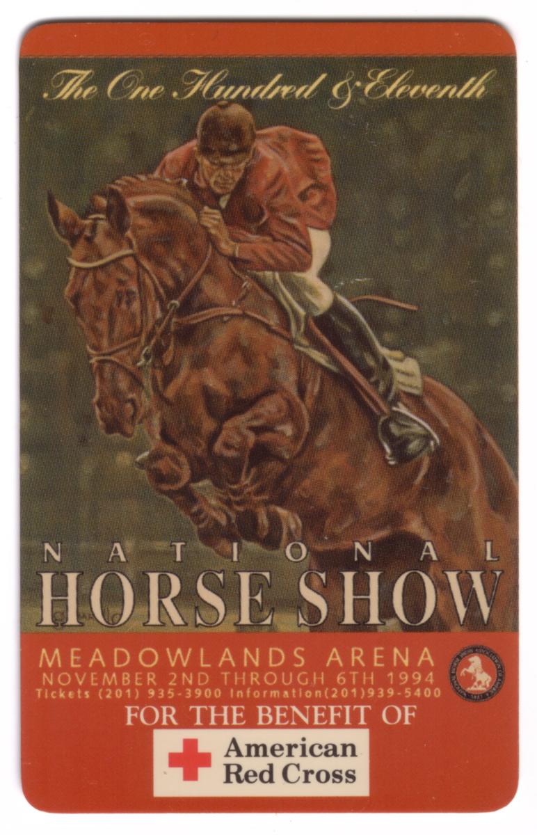 The card commemorates the 111th National Horse Show held at Meadowlands Arena from November 2nd through November 6th, 1994. It highlights that the event was held as a benefit "FOR THE BENEFIT OF" the American Red Cross, whose logo—a red cross on a white background—appears clearly on the card. Additional event contact information is provided with two phone numbers listed for tickets and general inquiries.