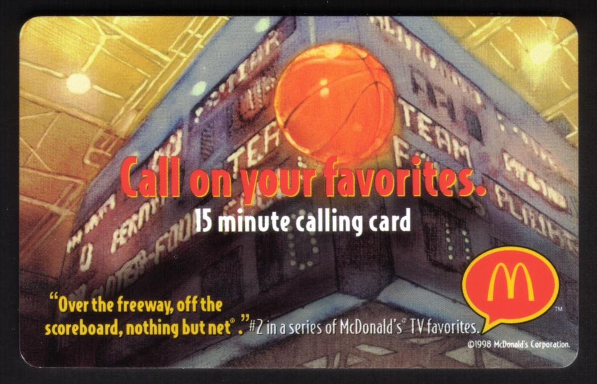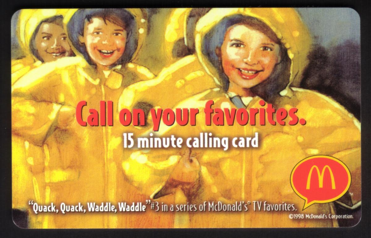 These three collectible 15-minute calling cards from 1998 feature McDonald’s promotional artwork tied to a series titled "Call on your favorites" highlighting McDonald’s TV favorites commercials. Each card displays unique illustrated scenes related to McDonald’s branding and advertising themes.