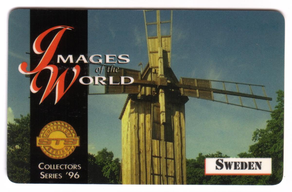 The upper left corner of the card displays the stylized title "Images of the World" in white and red lettering on a black vertical band. The country name "Sweden" is clearly shown in black text on a white background with a red border near the bottom right corner of the card. This phone card is part of a travel and sightseeing theme, showcasing cultural and architectural landmarks from around the world.