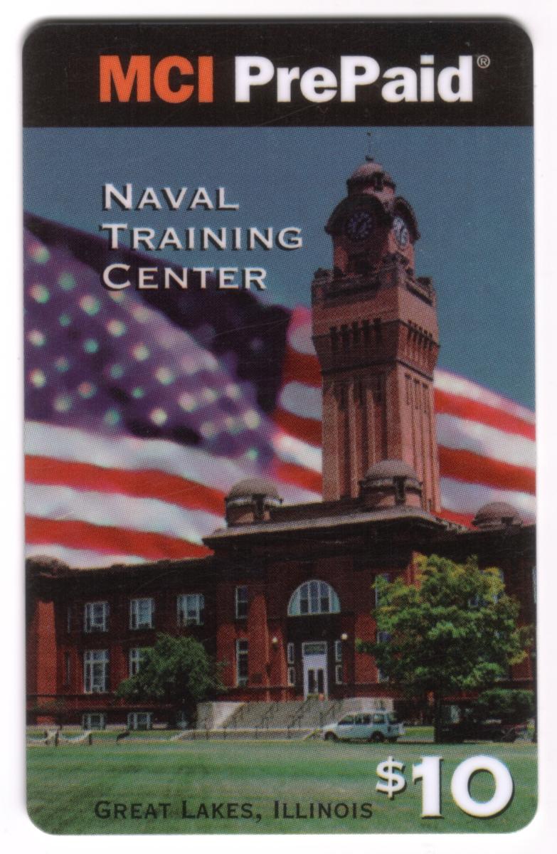 The text on the card includes "MCI PrePaid" at the top, "NAVAL TRAINING CENTER" in centered white capital letters over the image, and "$10" in white at the lower right corner. The location "GREAT LAKES, ILLINOIS" is printed along the bottom edge. Additional visible details include a tree and a vehicle near the building.