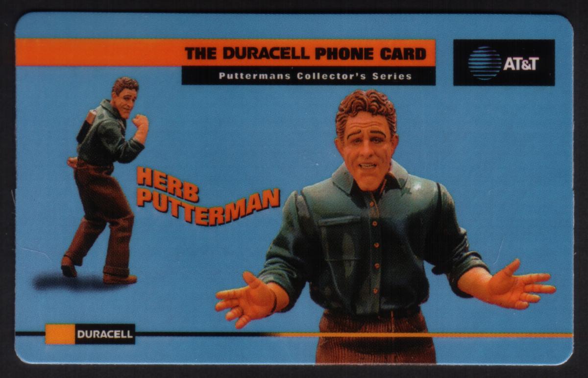 The first card has a blue background and features Herb Putterman in two poses: one full-body figure showing him mid-stride and a close-up of his upper body with open hands. Herb wears a dark green jacket and brown pants. The text "THE DURACELL PHONE CARD" and "Puttermans Collector’s Series" runs along the top with the AT&T logo in the top right corner. The Duracell logo is located at the bottom left.