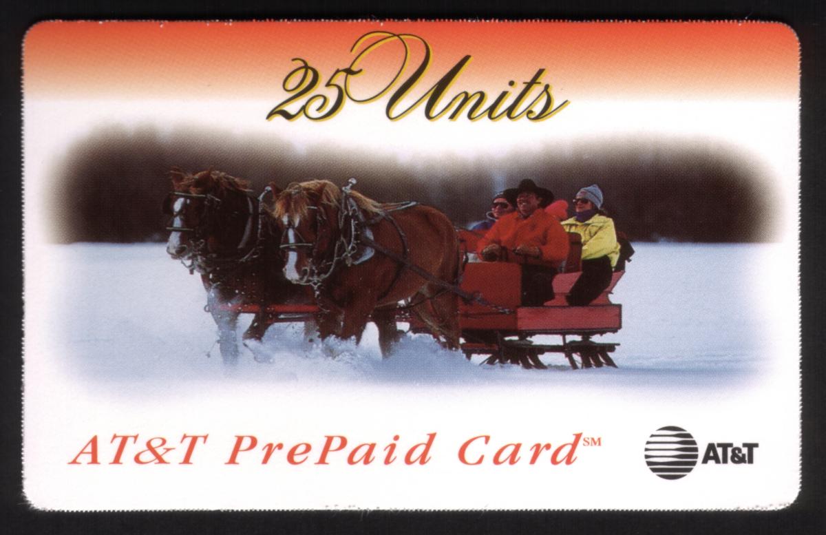 | 25u AT&T PrePaid 3 People Horse Drawn Sleigh Riding In Snow SPECIMEN |