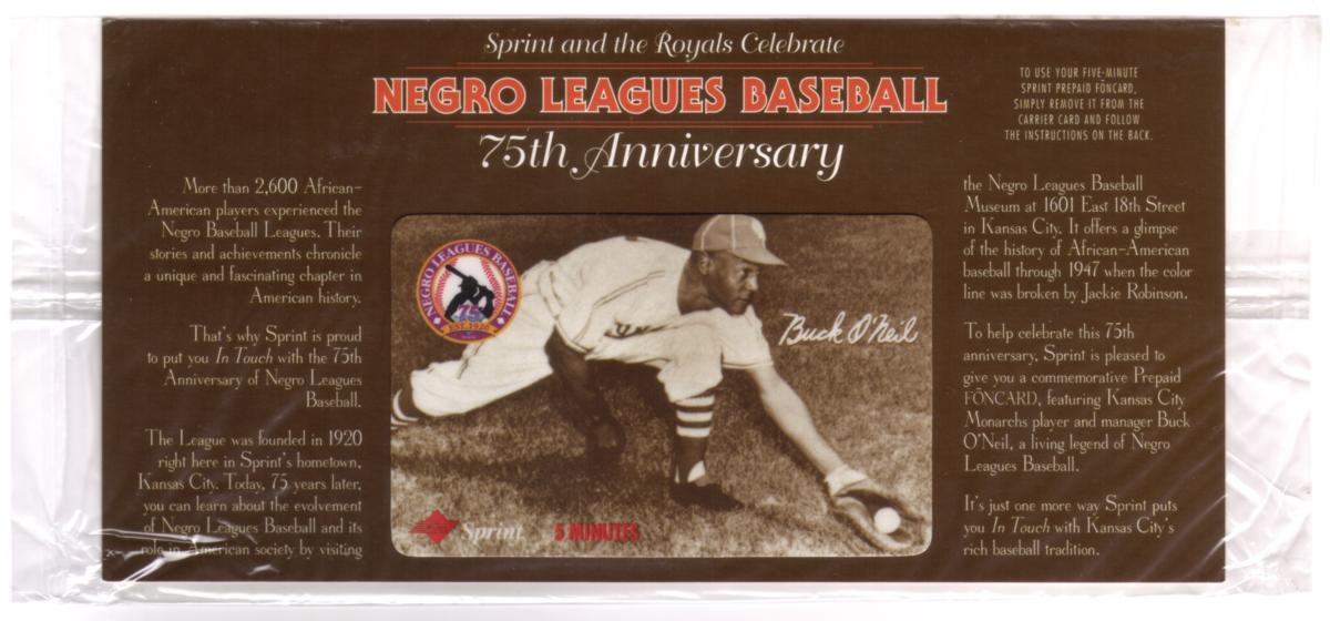 This Sprint promotional phone card commemorates the 75th anniversary of Negro Leagues Baseball, which was founded in 1920. The card celebrates the rich legacy of the Kansas City Monarchs and highlights Buck O’Neil’s important role within the league. The visual presentation honors the historical significance of Negro Leagues Baseball through the use of period imagery and official logos.