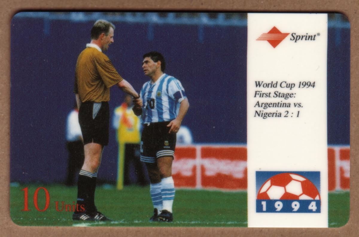This collectible Sprint phone card features a photograph from the 1994 World Cup USA soccer tournament. The image captures a moment from the First Stage match between Argentina and Nigeria, which ended with a score of 2 to 1 in favor of Argentina. The scene shows an Argentine player in the team's traditional blue and white striped jersey, black shorts, and blue-and-white striped socks engaging with a referee dressed in a mustard yellow shirt, black shorts, and black socks.