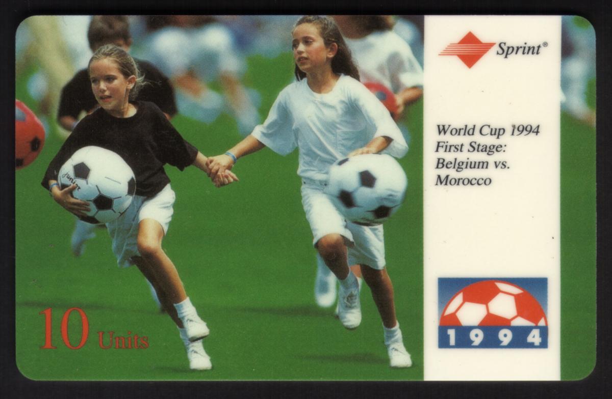 On the right side of the card, the Sprint logo appears in red above the text: "World Cup 1994 First Stage: Belgium vs. Morocco." Below this text is a graphic of a soccer ball with the numbers "1 9 9 4" underneath, representing the 1994 FIFA World Cup year.