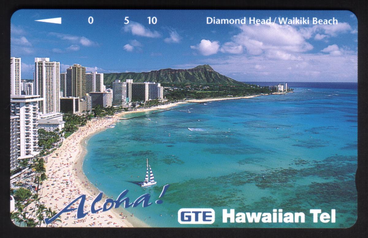 This collectible phone card features a vibrant, high-resolution aerial view of Waikiki Beach in Honolulu, Hawaii, with Diamond Head crater prominently visible in the background. The turquoise waters of the Pacific Ocean gently meet the curved stretch of white sandy beach lined with numerous sunbathers and beachgoers. Tall hotel and condominium buildings form a dense, urban skyline along the shoreline, highlighting Waikiki as a popular tourist and vacation destination.