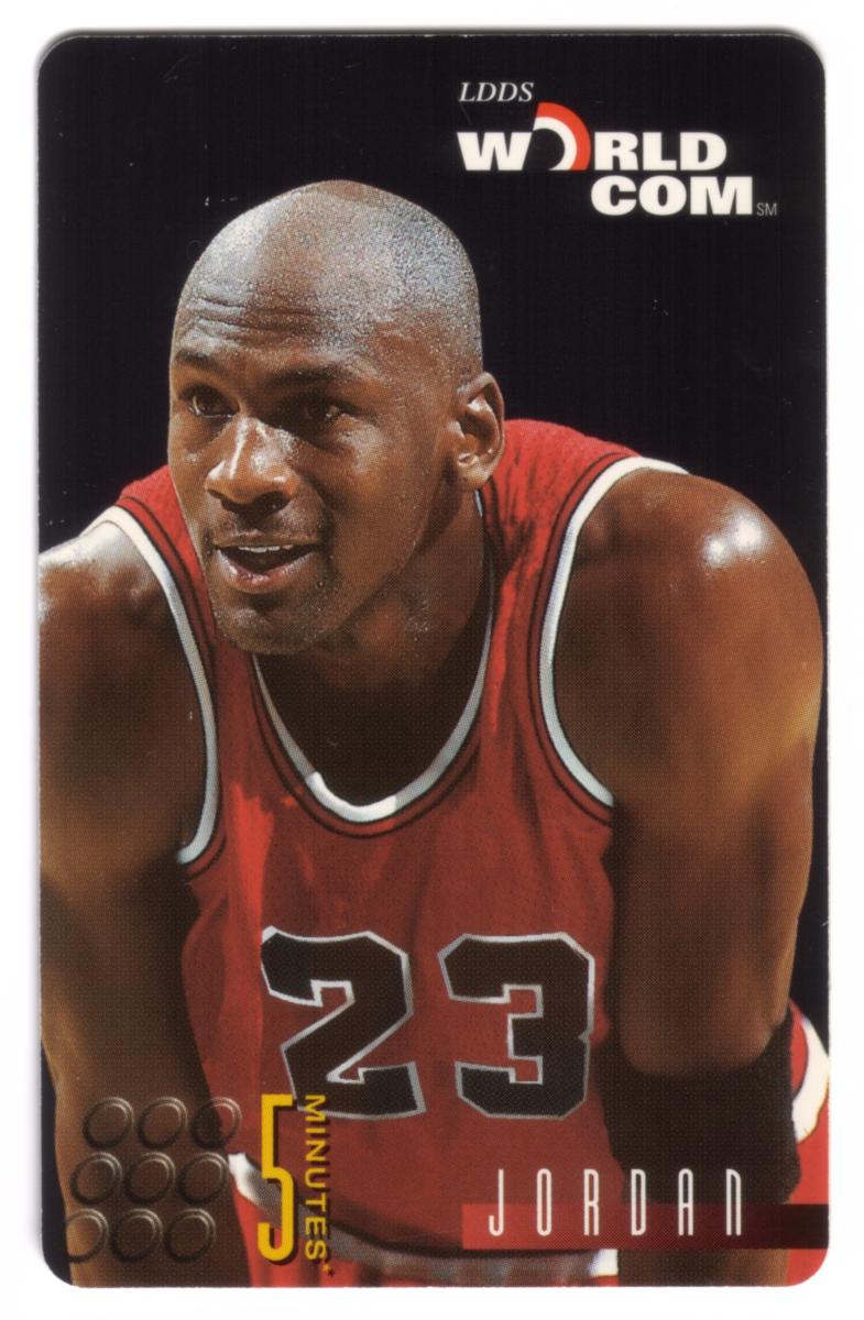 This LDDS WorldCom phone card is recognized as the first Jordan card issued by LDDS, making it a notable item for collectors interested in NBA memorabilia and basketball players. The design focuses entirely on Michael Jordan in his #23 red jersey, capturing a key moment of his athletic form.